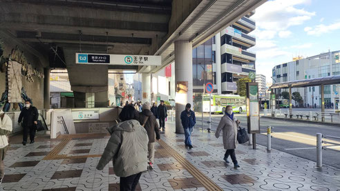 JR王子駅の改札ですが、ホームに降りて大宮方面の階段を降りると、北口改札に出ます。バスロータリー沿いに歩いていきます。